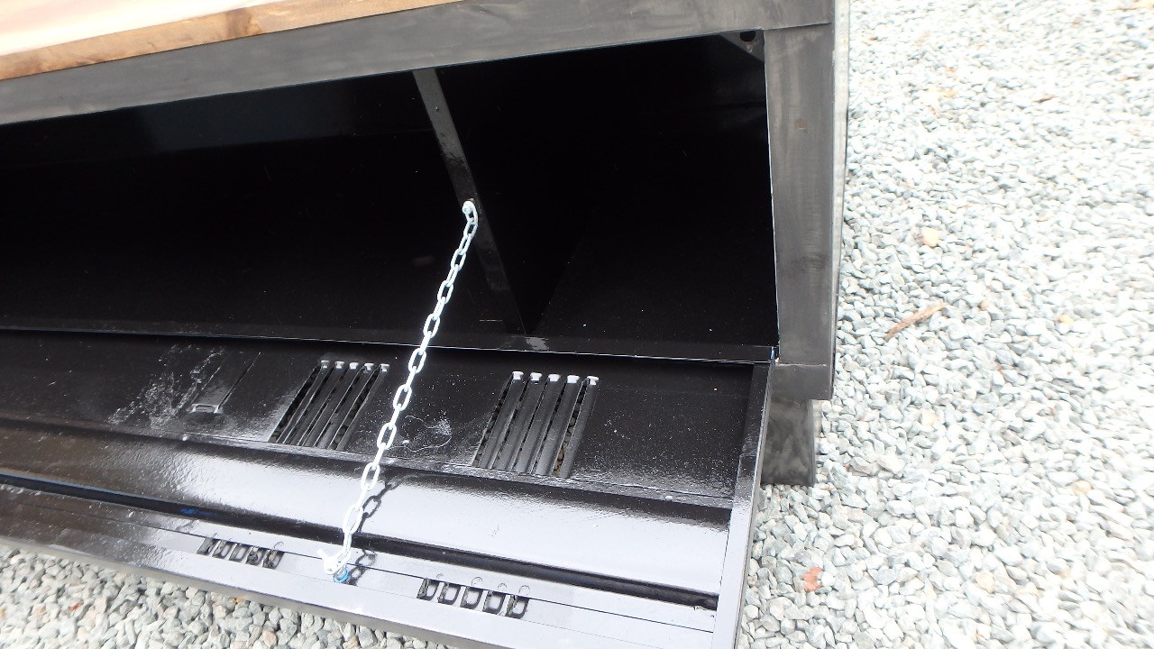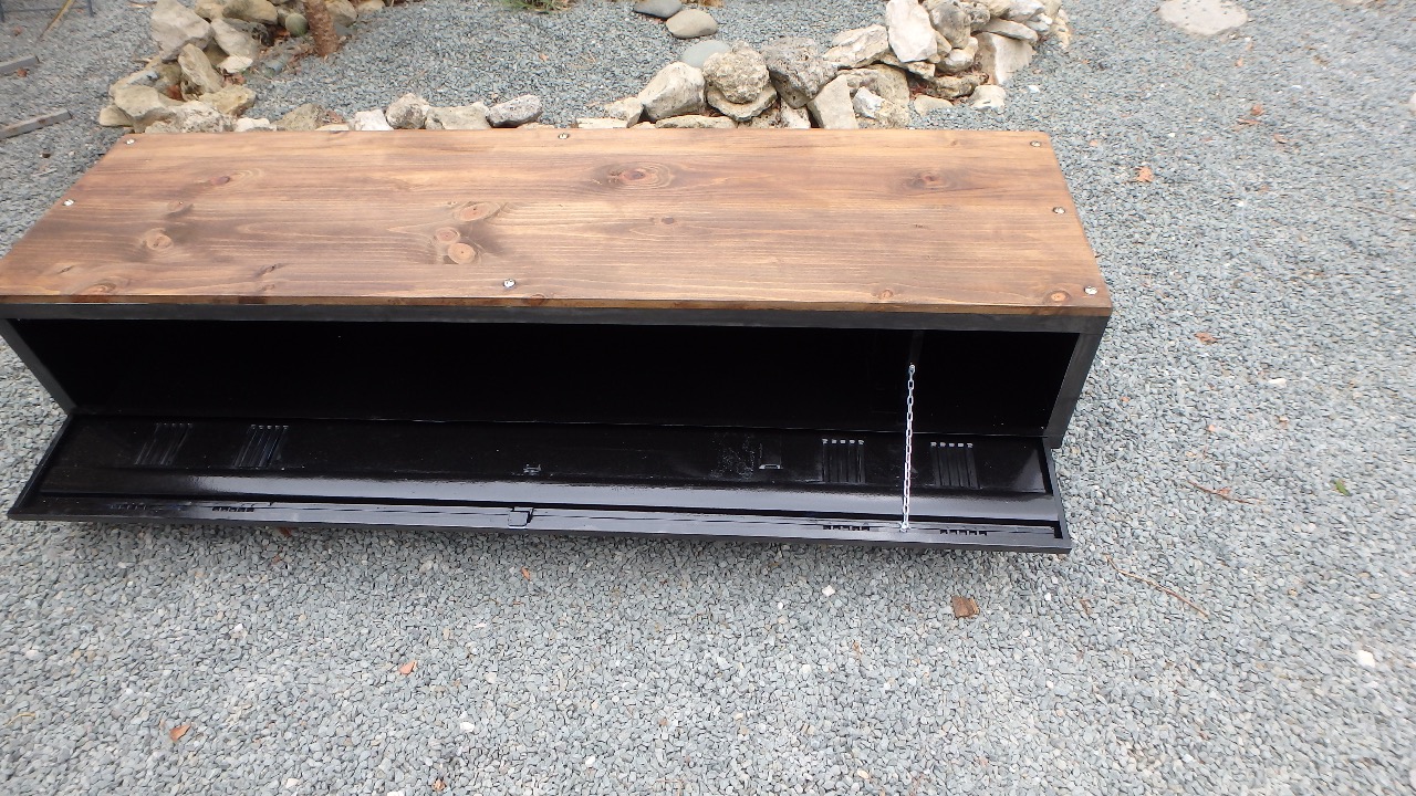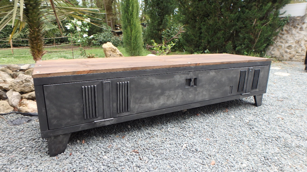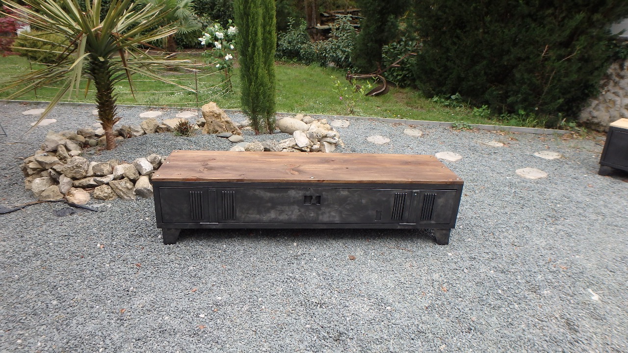 vestiaire métallique détourné en meuble télévision. Après un décapage et ponçage manuel le meuble a subit une coloration à la cire graphite et poncé pour lui redonner un aspect d'antan vieilli industriel .