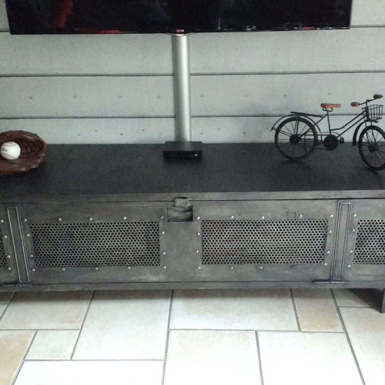 voici un vestiaire d'atelier métallique des années 70 , que j'ai revisité en meuble télévision.