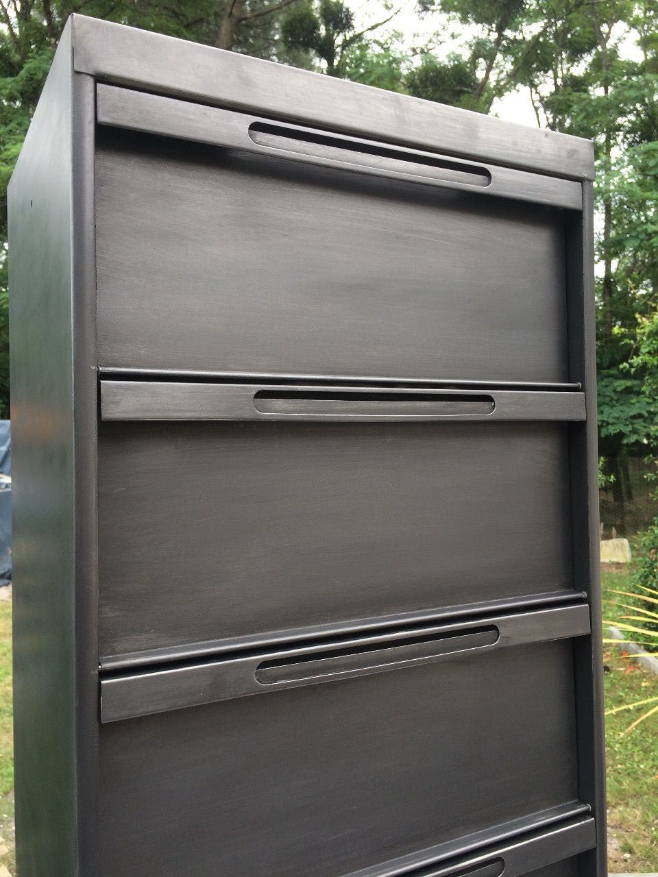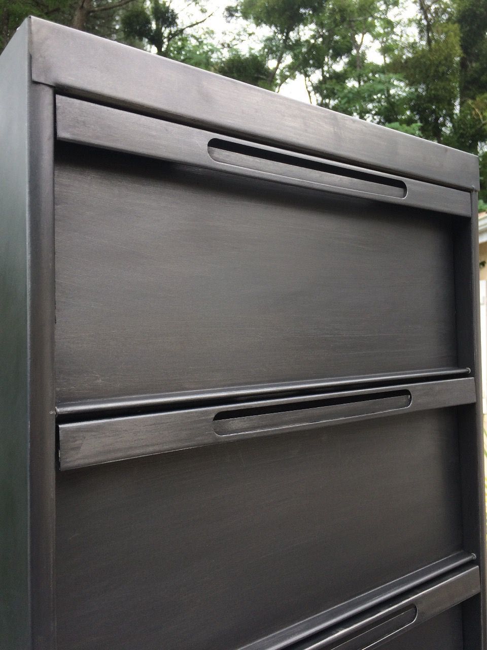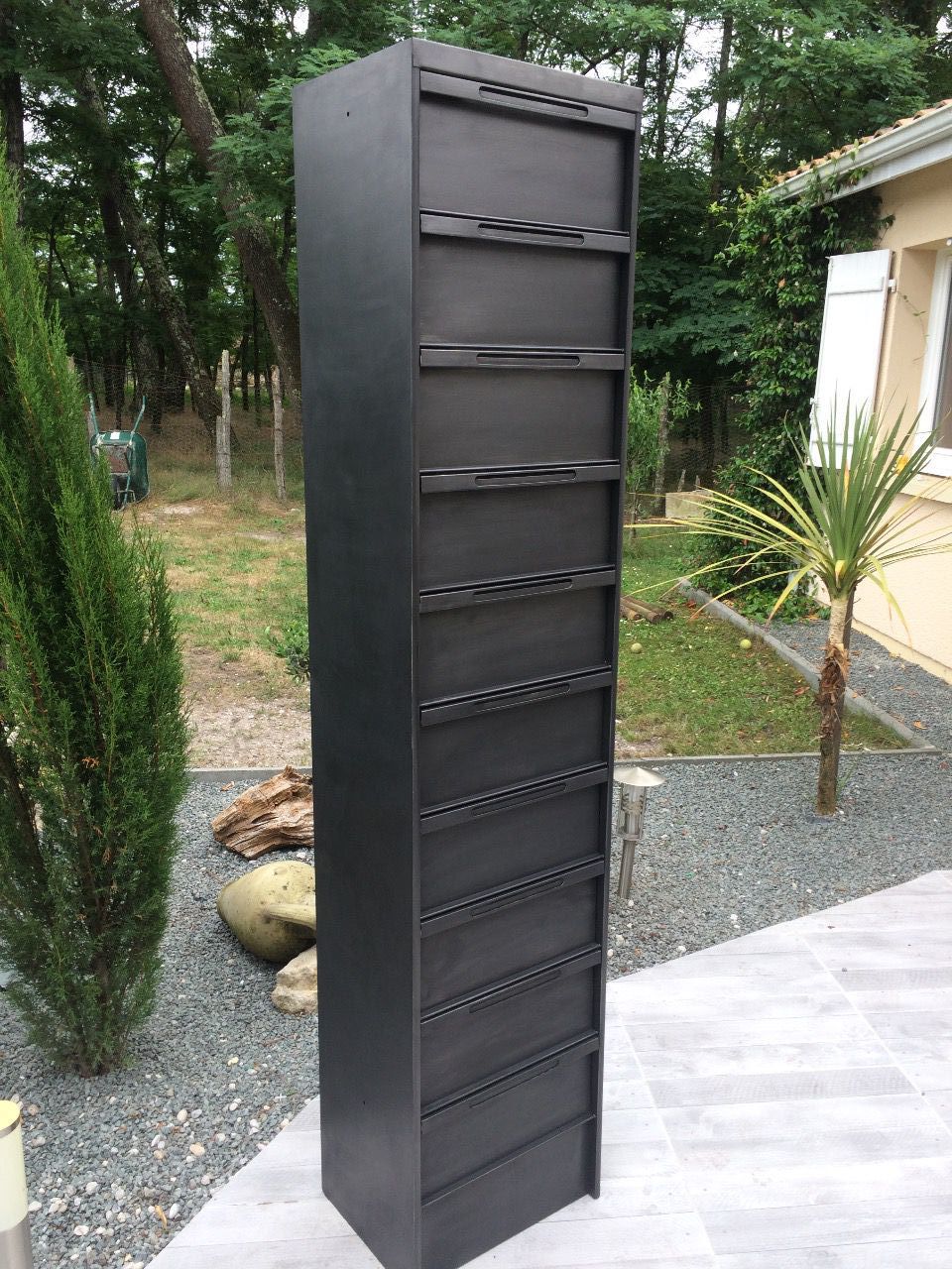 Voici ce meuble à clapets des années 60 rénové par mes soins ,revisité en meuble de salon de rangement. Entièrement décapé de sa vieille peinture , et traité à la cire graphite pour obtenir une teinte dites "canon de fusil ",